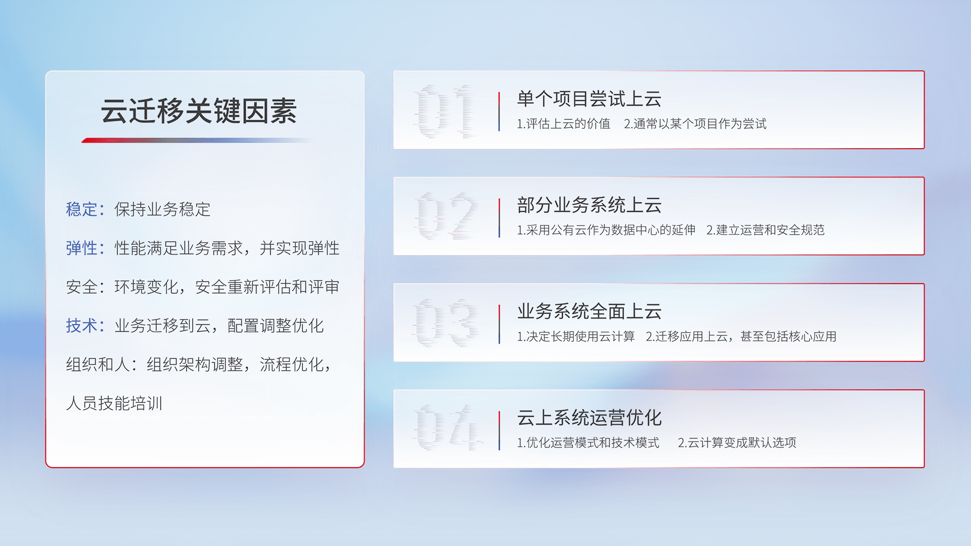 结合实际业务,,,,从规划设计、、、、云平台选型、、、云原生改造、、数据迁移、、、集成交付,,迁移全过程为客户识别最佳上云路径,,做好风险识别管理,,,设计网络架构、、、身份权限、、、、安全审计合规、、、操作审计、、日志审计、、监控告警策略、、、、多站点容灾设计等,,,对云上基础设施进行整体规划,,提升IT治理水平,,,,以满足弹性、、、高可用、、高性能的需求。。。。