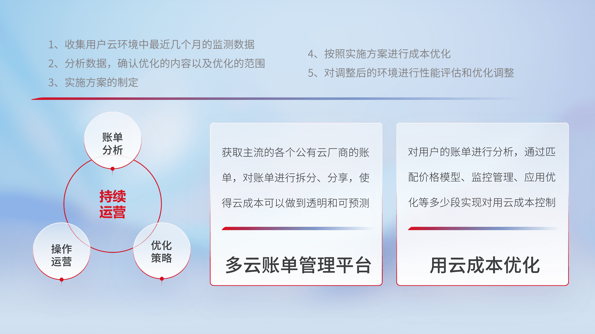 通过多云纳管,,以统一的资源数据模型把客户的云资源进行抽象和封装,,,,进而实现对多云资源的统一操作,,,保障云资源管理的可靠性、、、稳定性与可用性。。量身定制化运维内容,,,,配置、、、开发运维、、、、补丁管理、、、、备份、、、监控、、认证和访问管理、、、、审计和日常巡检等,,,保障在用云过程中的可靠度,,,稳定度以及高可用率。。。。